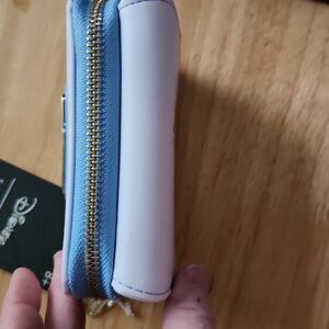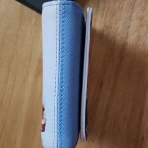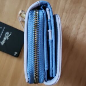 Charming Disney Loungefly wallet featuring Alice in Wonderland design. Vibrant blue with colorful floral accents.