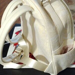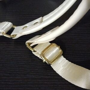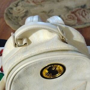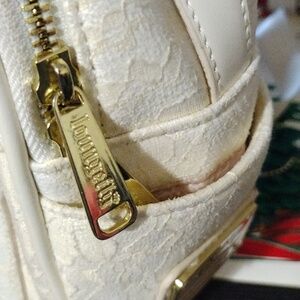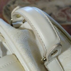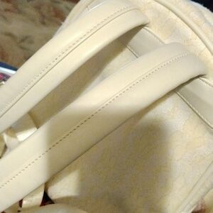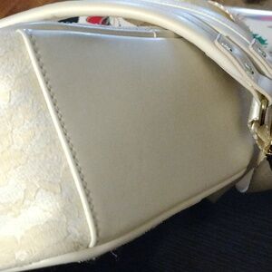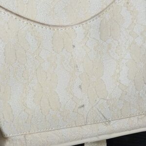 Very good condition. Clean inside. Has very minor soiling and pearls came off the front pocket. Lace design with off white vinyl trim. Straps and adjustable for comfort. Smoke and pet free home.