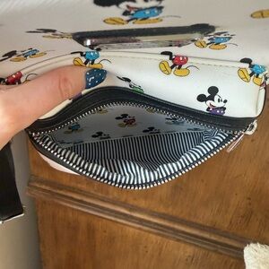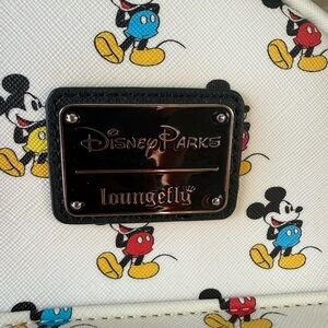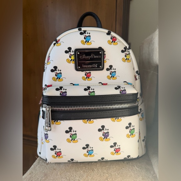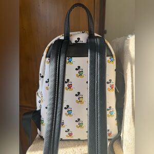 Adorable mini backpack with colorful Mickey Mouse design. Features vibrant characters on a white base. Ideal for young Disney enthusiasts.