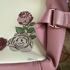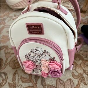 Adorable Disney backpack with Beauty and the Beast design. Features pink and white colors with floral accents.