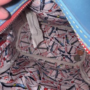 Colorful Loungefly mini backpack featuring Chucky's Good Guys design. Vibrant blue with red, green, and yellow accents.