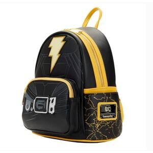 Get ready to bolt! Grab this striking Loungefly DC Comics Black Adam Light Up Mini Backpack before it’s gone. This mini backpack replicates the electrifying features of Black Adam’s super hero outfit. On the front, an applique of the Black Adam lightning bolt activates with an LED light. The front zipped compartment is topped off with a gold lightning bolt metal charm, and the features of the belt are brought to life in debossed detail. Lightning strikes carry through as a motif on the side pockets, and on the back, gold metallic ink spells out Black Adam.