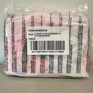 NWT Loungefly Disney 100 Stitch In Cheshire Cat Costume Wallet. Using his crafting skills, Stitch has created a costume for his role as the Cheshire Cat. Wearing a homemade headband, feather duster tail, and a striped pink sweater, he perches on a palm tree with a grin.