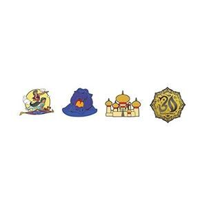 Show off your Disney fandom with this fun Aladdin 30th Anniversary 4 Piece Enamel Pin! A treasure trove of details and memorable places and characters awaits you including Aladdin Jasmine and Abu enjoying a magic carpet ride; the Sultan’s Palace; and the open tiger jaw of the Cave of Wonders. The fourth pin is a gold-glitter 8-point star geometrical piece with the 30th Anniversary logo. This pin set makes the perfect accessory for any Disney fan! Each enamel collector pin measures approximately 1.5-inches. Officially licensed Disney collectible. Produced by Loungefly.