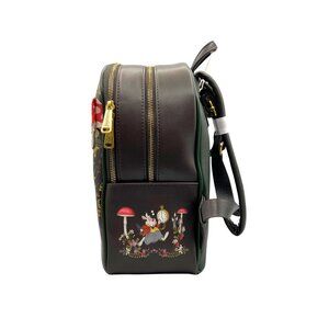 Loungefly Disney Alice in Wonderland Alice Mushrooms Backpack. The mini backpack has an Alice on a forest trail surrounded by mushrooms (embroidered). Side pockets feature the White and the back has Cheshire Cat. This mini backpack has 2 zippered pockets and one interior zipped pocket. The inside lining print has Alice, Cheshire, White Rabbit, mushrooms, and flowers. The mini backpack also has comfortable and adjustable padded shoulder straps, a top handle, and gold-colored hardware.