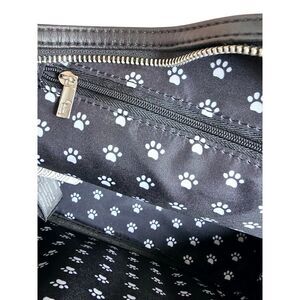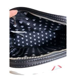 The interior has a zipper pocket and a paw print lining. The backpack is made of faux leather and has a zipper closure. This item is in excellent used condition and is a great addition to any casual outfit.