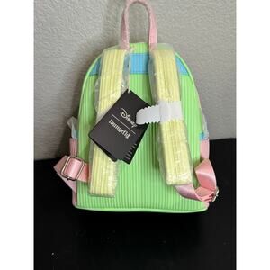 Experiment with your look with these cool colors! This Lilo & Stitch mini backpack features a corduroy patterned body, adorned with a sherpa detail of Stitch and Angel amid hearts. Color blocking adds a pastel touch, studded with a Loungefly label on the front pocket.”