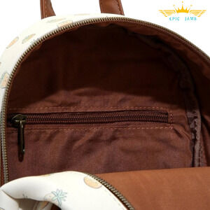 * This mini backpack bag from Lilo & Stitch is printed all over with pineapples and Stitch drinking from a coconut on the front zipper pocket, with a brown panel above that says his name and "Ohana means family." Featuring adjustable straps, top zipper closure, top carrying handle and internal zipper pocket.