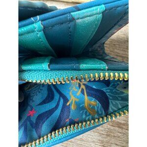 This Disney Loungefly wallet features an enchanting Little Mermaid design, showcasing Ariel, Flounder, and Sebastian amidst an undersea backdrop. The wallet includes multiple card slots and a secure zipper closure, making it both functional and stylish. Ideal for fans of the classic Disney film, this wallet adds a touch of whimsy to everyday essentials.