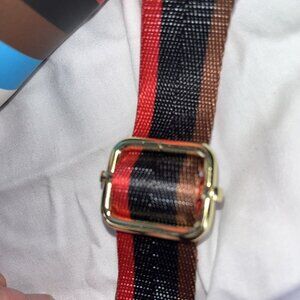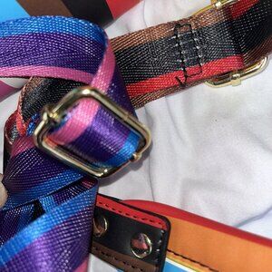 The bag features a striped pattern with a multicolor exterior and lining, and a silver hardware color.
