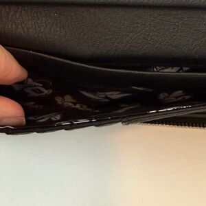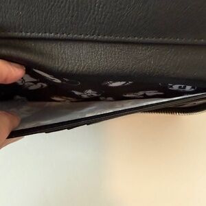 Minnie's signature style gets a classic denim makeover! This polka dot denim wallet will never go out of style, just like our leading lady. The exterior features a die-cut polka dot bow and ears on the front, with an enamel brand badge on the other side. Zip it open to reveal a sleek faux leather interior with 2 bill compartments, 7 card slots, a zip pocket, clear ID slot, and black lining featuring Mickey and Minnie!