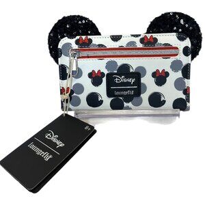 This Loungefly snap wallet has an allover print of black and grey polka dots and Minnie Mouse's head silhouette. It is topped with 3D sequined ears and a faux leather red bow. The back has a zippered pocket, and the inside has card and cash slots, plus clear ID display. (NWT)