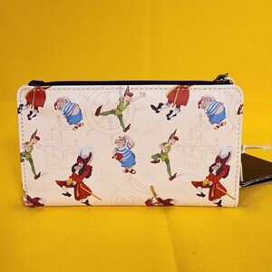 This wallet features the Jolly Roger symbol on the front. On the back, you’ll find images of Peter Pan, Captain Hook, and Mr. Smee surrounded by illustrations of pirate ships, Jolly Roger flags, and ship wheels. Inside, there are seven card slots and one clear slot for an ID.