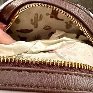 Sheriff Woody Toy Story inspired mini backpack by Loungefly. Featuring a whole passel of appliqués, a cactus and cowboy lining, and a metal star.