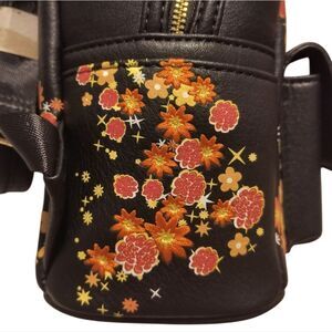 Seize your moment in style! Inspired by Disney Pixar's Coco, this Loungefly mini backpack will harmoniously complement your outfits. The magical graphics feature embroidery reminiscent of the marigold bridge from the film! Additional details include a front button flap pocket, main zip compartment, brand badge, guitar zipper pull, debossed details, gold tone hardware, two side pockets, and adjustable straps.