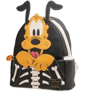 NWT - Feeling a little spooky? Have some wicked Halloween fun with your buddy Pluto and this fantastic Disney Pluto Skellington Glow-in-the-Dark Mini-Backpack- Entertainment Earth Exclusive! Measuring about 10 1/2-inches tall x 9-inches wide x 4 1/2-inches long, the faux-leather backpack features top zipper closure, a front zippered pocket, adjustable straps, matching lining, and shiny gold hardware. Plus, there are glow-in-the-dark, applique, and printed details! It's fun, it's handy and functional, and it's a limited edition exclusive you don't want to miss. This would make a great gift for any Disney fan!