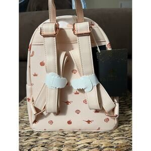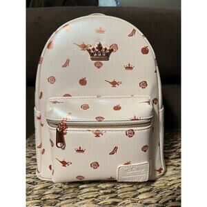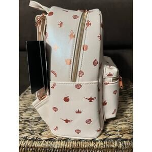 All the Disney Princesses have their thing. This mini backpack shows icons for each, from Jasmine's magic lamp to Belle's rose, to Ariel's shell and Snow White's apple. Front zippered pocket, interior pocket and adjustable straps. There's also a gold-tone crown emblem on the front.