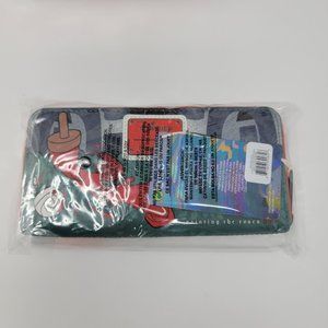 Wallet: The front depicts the scene in which Alice paints the roses red in the Queen’s royal gardens. The back displays the evidence that the Queen will use against her: a smear of red paint and half-tinted roses. Note the coordinating red-and-black motif on the inside lining. In addition to printed details, this wallet includes ID window, credit card slots, zippered coin compartment, applique work, and is fashioned from vegan leather (polyurethane). This wallet is an officially licensed Disney product. Dimensions: 8” x 4”