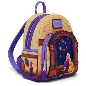 Get ready for the best day ever with this Tangled mini backpack! Featuring an applique of Rapunzel sitting at her window, the front pocket also includes a lenticular portrait of the floating lanterns. With embossed details on the side pockets and painting details across the body, this bag is perfect for your next trip to the Disney Parks. Don't forget the matching wallet sold separately!