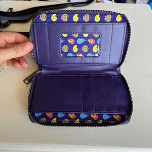 Rare Loungefly Disney Villains in the Dark zip-around wallet. Features bold neon portraits of fan-favorite villains — Hades, Evil Queen, Ursula, and Dr. Facilier — with matching villain symbols on the back. Inside, a colorful villain-patterned lining, multiple card slots, and clear ID window keep essentials organized. Perfect for Disneybound looks, Halloween season, or collectors who love the darker side of Disney.
