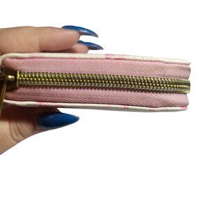 EUC super cute wallet features an image of Winnie the Pooh surrounded by cherry blossoms. Inside has clear ID display and card slots. Wrap around zipper closure. Has some signs of use on the pink fabric around the zipper. Can be cleaned.