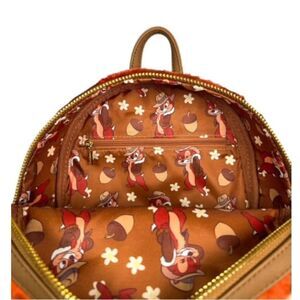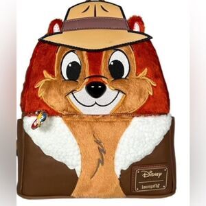 The exclusive Loungefly Chip n’ Dale Rescue Rangers CHIP Cosplay Mini Backpack has finally arrived. Complete your collection with this gorgeous plush Mini Backpack. On the front, Chip wears his signature bomber jacket while his Indiana Jones like hat rest atop his head. This small-but-mighty mini backpack makes an adventurous addition to any outfit and will keep your essentials safe on any mission. Act fast to collect; supplies are limited. Chip is made of vegan leather (polyurethane) and plush. The bag has adjustable shoulder straps and sturdy metal hardware. Additional features include applique, printed, and embroidery details, a detachable plush tail, and custom zipper pull the Rescue Rangers logo. Take note of the coordinating inside lining. This backpack is an officially licensed Disney product. Backpack dimensions: 9”W x 10.5”H x 4.5”D