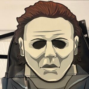 Stylish Loungefly backpack featuring Michael Myers design. Perfect for horror fans. Durable and eye-catching.