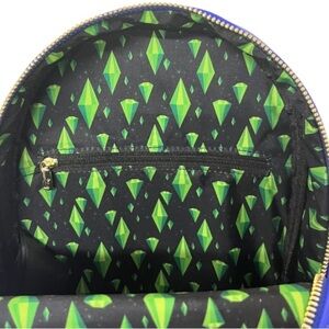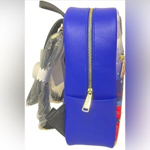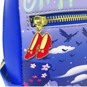 Loungefly Exclusive Wizard of Oz Mini Backpack is here to take us on a fun magical adventure. The front of the bag has Dorthy, Toto, Scarecrow, Tin man, and Cowardly Lion walking down the yellow brick road with Emerald city behind them. Above the bag, we see two flying monkeys in the night sky. We have a pair of ruby slippers ready for you as the enamel zipper charm on the front pocket. When you turn the bag around, you'll find the Wicked Witch of the West being sneaky. Let's click our heels together to join Dorthy in Oz with this exclusive bag! Color: Indigo.