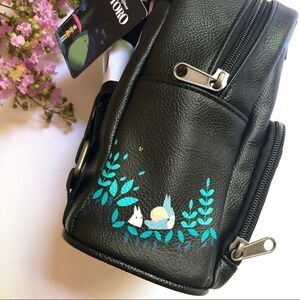 This adorable backpack features Studio Ghibli Totoro characters and beautiful blue leaves. The black gives it a more sophisticated look while still maintaining its cuteness!