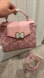 Charming pink bag with cute character design. Features a blue bow accent. Perfect for kids.