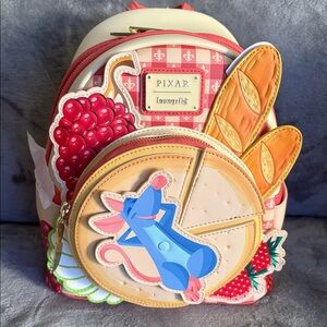 Charming Loungefly backpack with Ratatouille theme. Features red and yellow accents with playful food designs. Brand new with tags. This bag is scented and smells amazing!