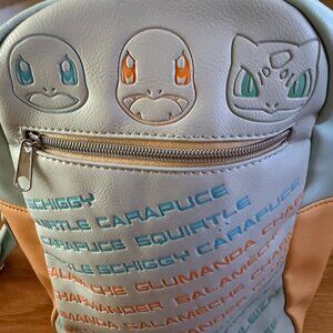 Loungefly Pokémon Generation 1 Starters Mini Backpack. Squirtle, Bulbasaur, and Charmander characters are on the front along with the names of the three starters written in French, German, and English Repeating in hues of green, orange, and blue. Front zipper pocket. One section main pocket lined with gray fabric. Top handle. Light blue adjustable straps with Squirtle, Bulbasaur, and Charmander in white. Simulated faux leather in light blue, yellow, and gray. Silver-toned hardware and zippers. Overall, excellent pre-owned condition, but a few flaws. There is one tear near at the zipper of the front pocket. There is one scrape on the front near the blue lettering. One small scrape on the bottom near the green lettering and another on the side light blue faux leather near the zipper. There may be some other flaws that I did not notice. Interior is overall clean, but some small stains on the bottom fabric. Discoloration on the straps, mainly near the side edges.