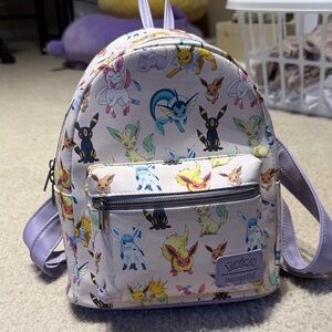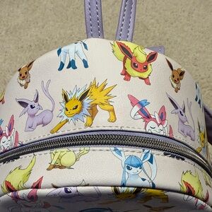 Charming Loungefly backpack with Eevee Evolution design. Features pastel multicolor Pokémon characters. Perfect for young fans.