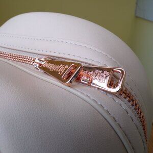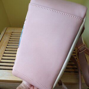 Features include main zip compartment with sketch of princesses, interior zip pocket, pink interior lining with an allover accessories print, front zip pocket with rose gold hardware, enamel brand badge, side pockets, adjustable straps.