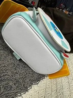 Loungefly mini backpack featuring Chip 'n' Dale Rescue Rangers artwork. Bright red top flap and soft pink side panels. Light blue front background with white front pocket. Yellow wing accents and multicolor character print.