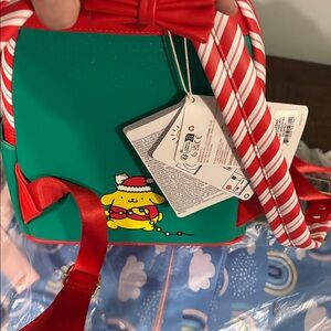 Festive Loungefly backpack. Features cute holiday design. Red and green with playful accents.