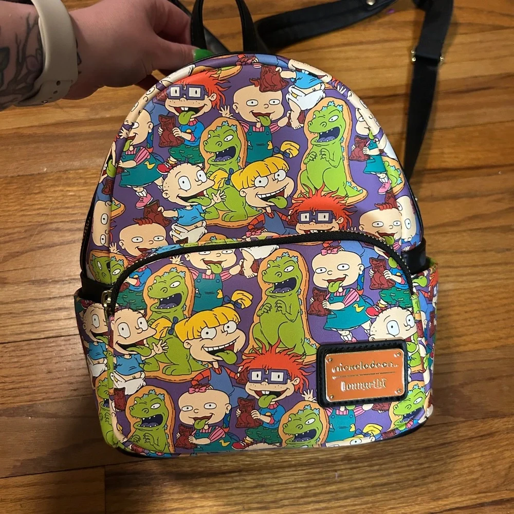This vibrant Loungefly backpack showcases a playful all-over Rugrats print in bright colors, making it a standout accessory for any adventure. Crafted from durable fabric, it combines style and functionality, perfect for everyday use. In good condition!