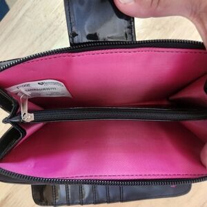 Elegant black zip around wallet with Hello Kitty embossing. Features a shiny finish and secure clasp. In excellent pre-owed condition.