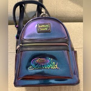 Chic Loungefly backpack with iridescent finish. Features SeaWorld logo. Stylish and vibrant. Beautiful iridescent backpack, perfect for all occasions! No longer sold! Grab it today!