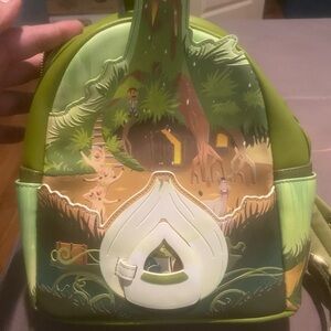 Vibrant green bag with Shrek design. Features durable zippers and iconic graphics. Ideal for fans.