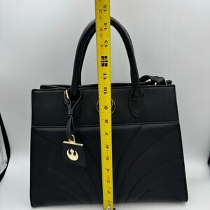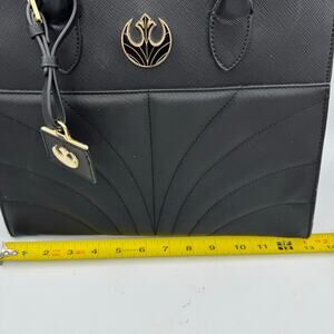 This Loungefly Star Wars Rebel Alliance black satchel handbag blends timeless elegance with fandom style. Crafted from saffiano-textured faux leather, it features gold-tone Rebel Alliance insignia hardware, a detachable charm tag, and protective metal feet. Its structured silhouette and 12"W x 9.5"H x 5"D dimensions make it ideal for everyday use or conventions. Inside, the logo-printed fabric lining offers both style and practicality with multiple compartments for easy organization. Perfect for collectors, DisneyBounding, or anyone seeking a chic galactic-inspired handbag that pairs effortlessly with streetwear and modern geekcore aesthetics.