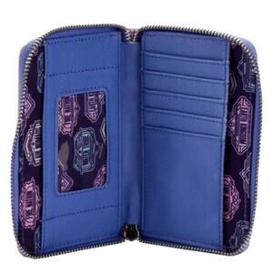 Wallet zips closed and features include shiny silver hardware, vegan leather (polyurethane), five card slots, a clear slot for holding your ID, and embossed, debossed, and printed details. Note the coordinating lining.