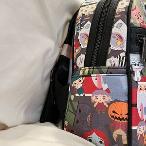 This is a fab collectible bag 25th Anniversary NBC original heart logo Loungefly and still NWT! The Nightmare Before Christmas characters come to life in a chinos style backpack. Made of vegan leather. Featuring a front zipper pocket, top zipper closure, 2 side pouch pockets and adjustable straps. Fun coordinating lining. Authentic merchandise ships fast usually within a business day.