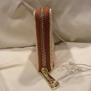 Such a unique design of an exceptionally adorable Stitch and Lilo! Textured like woven raffia on the body, Stitch and Lilo are hula dancing with appliqué grass skirts and embroidered flowers. This zipper wallet comes with card slots and a clear ID display. Made of vegan leather and gold-tone hardware. Authentic merchandise ships fast usually within a business day.