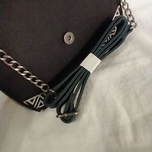 Black with silver glitter design printed on the faux leather. The flap is a deep teal type color. The Black Panther emblem is metal. The strap is metal with faux leather. Approximately 12.5"W x 11"H x 4"D. No rips, tears or stains. Smoke free/Dog friendly home.