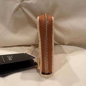 Such a unique design of an exceptionally adorable Stitch and Lilo! Textured like woven raffia on the body, Stitch and Lilo are hula dancing with appliqué grass skirts and embroidered flowers. This zipper wallet comes with card slots and a clear ID display. Made of vegan leather and gold-tone hardware. Authentic merchandise ships fast usually within a business day.