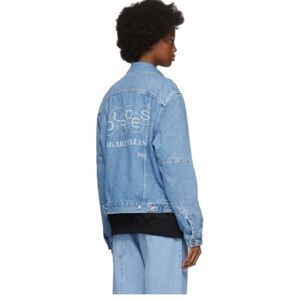 Long sleeve paneled non-stretch denim jacket in blue. Spread collar. Button closure at front. Buttoned flap pockets at chest. Welt pockets at waist. Single-button barrel cuffs. Logo printed in off-white at back. Adjustable buttoned tabs at back hem. Logo-engraved silver-tone hardware. Contrast stitching in white.Supplier color: Blue