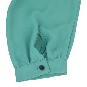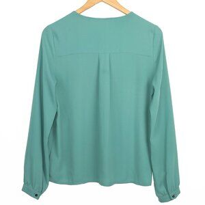 This chic Love 21 by Forever 21 blouse features a beautiful colorblock ombre design in cool hues of teal, turquoise, and navy blue. Made from lightweight 100% polyester, it has a flowy silhouette with long sleeves, button cuffs, and a hidden button-down front detail. Women’s size Small.