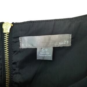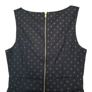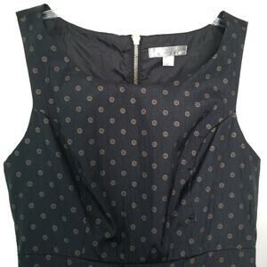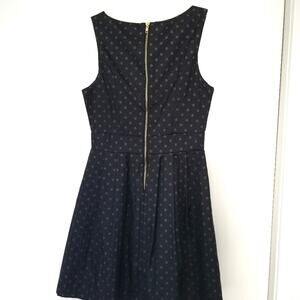Elevate your wardrobe with this chic and classic Love 21 by Forever 21 fit & flare dress in Size Small. Crafted from lightweight polyester with a subtle black-navy hue, this sleeveless dress features a stylish boatneck neckline, pleated skirt, and an elegant open polka dot design. Finished with a striking gold-toned back zipper, it's perfect for dark academia, work, or college wear.