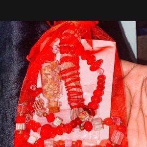 Red Coral and Fluorite bracelet with a Selenite pendant a Sage bundle and balance bottle